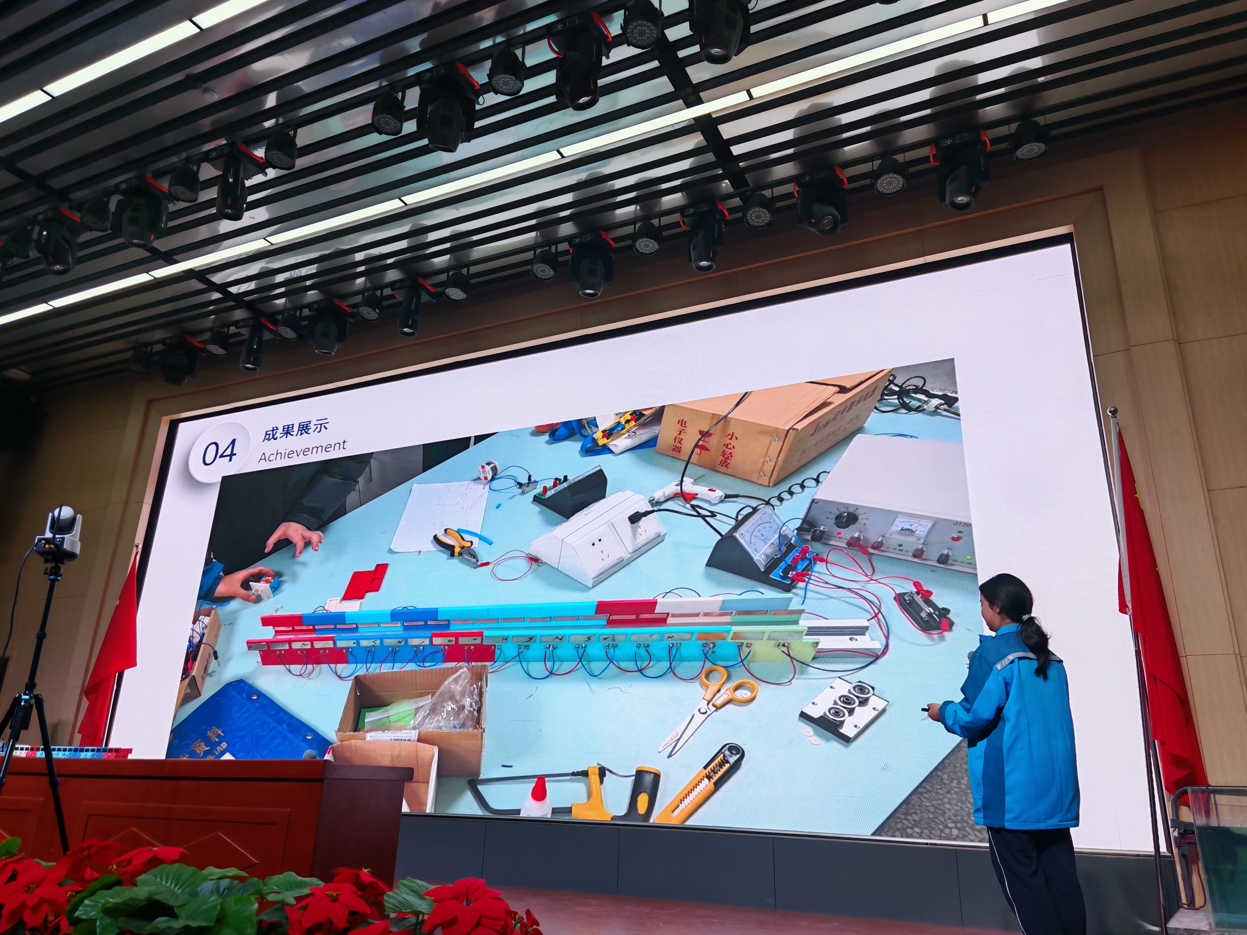 在今年的校园科技节上,物理老师赵江鹏带领六名八年级学生,历时一月,完成了《迷你电磁弹射》科学实验的策划、设计、制作等环节,并在数百名师生的见证下,成功演示了电磁弹射的过程。